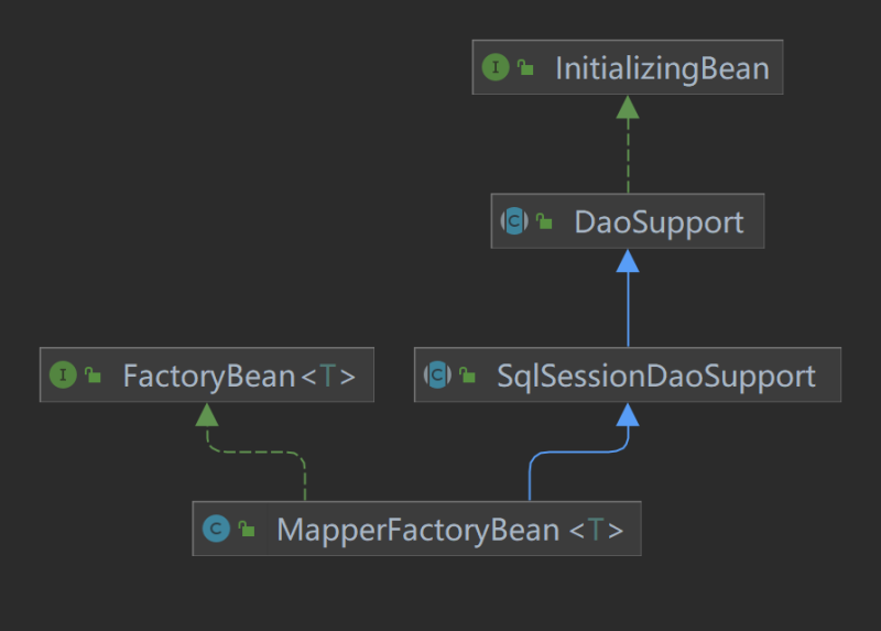 这里Spring准备的是接口类型和创建代理对象的代理工厂。具体如何准备的呢?来看上述MapperFactoryBean类型的整体继承关系: