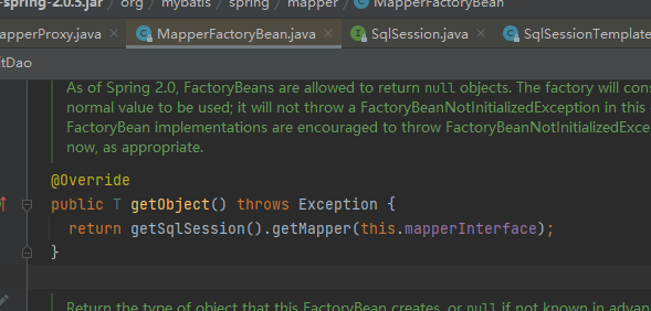 上述动作已经准备好了,接下来就应该是创建了。Spring在创建完成MapperFactoryBean对象后,最终会调用它的getObject方法来获得真实的对象: