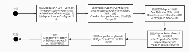 我们分析源码,第一步得找到它的入口,Spring整合MyBatis的入口,毫无疑问是MapperScan这个注解,在MapperScan注解上包含Import(MapperScannerRegistrar.class)注解,Spring整合MyBatis正是用了Import和ImportBeanDefinitionRegistrar的方式。我们先通过一张流程图来了解下整体流程,然后再慢慢品。