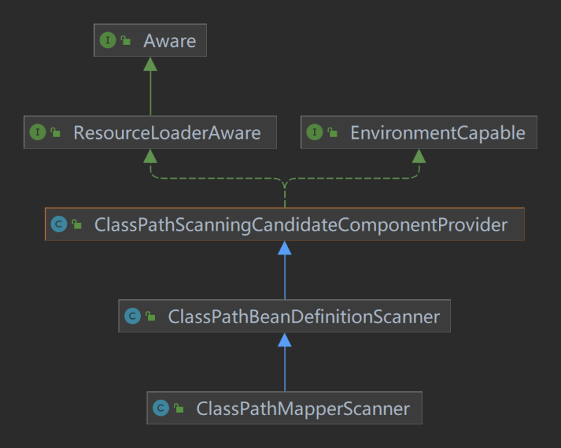 它定义了ClassPathMapperScanner这个扫描器,然后使用这个扫描器来扫描类,扫描哪些类呢?扫描有Mapper注解的类,看它的关系知道,它是ClassPathBeanDefinitionScanner的子类,而spring则是使用ClassPathBeanDefinitionScanner来进行扫描的。