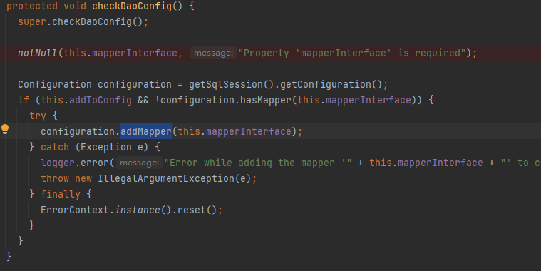 它实现了InitializingBean,于是可以知道,在MapperFactoryBean初始化完成后,Spring会调用它的afterPropertiesSet方法,从而会执行到checkDaoConfig方法: