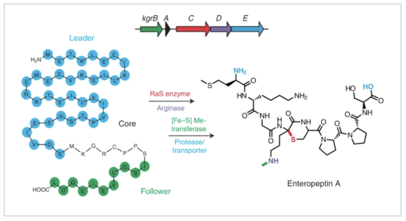 细菌基因 kgrA-E,如顶部箭头所示,编码肠肽前体肽和四种定制酶。这些酶修饰核心并去除前体的前导片段和跟随片段以产生肠肽A。