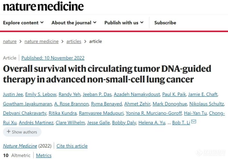 今天,《自然·医学》杂志刊登了一项研究结果[4],纪念斯隆·凯特林癌症中心(MSKCC)的研究人员在一项大型前瞻性NSCLC国际队列中,验证了ctDNA阳性结果与更低的总生存率(OS)有关(HR=2.05,p<0.001),且独立于临床病理特征和肿瘤代谢体积,接受ctDNA测序后匹配的靶向治疗的患者相比未接受的,OS更高(HR=0.63,p<0.001)。