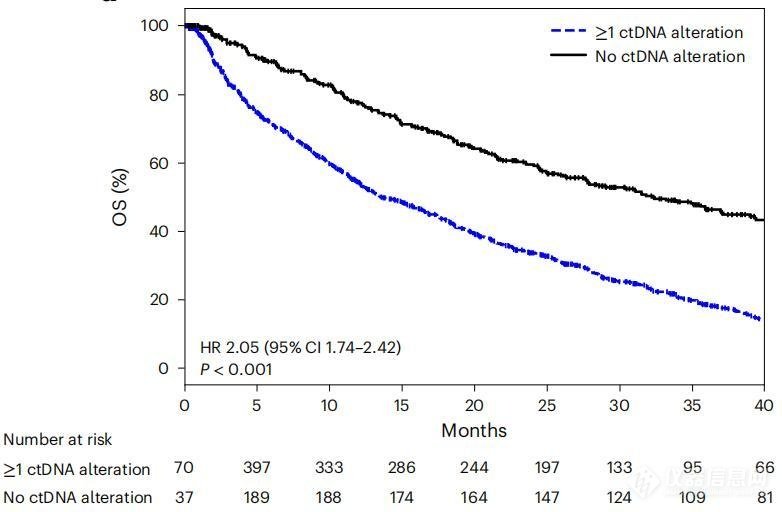 有ctDNA变异(蓝)和无变异的患者的OS