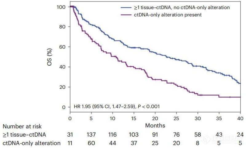 仅ctDNA检测到变异的患者(紫)与ctDNA和组织测序均检测到变异的患者(蓝)的OS