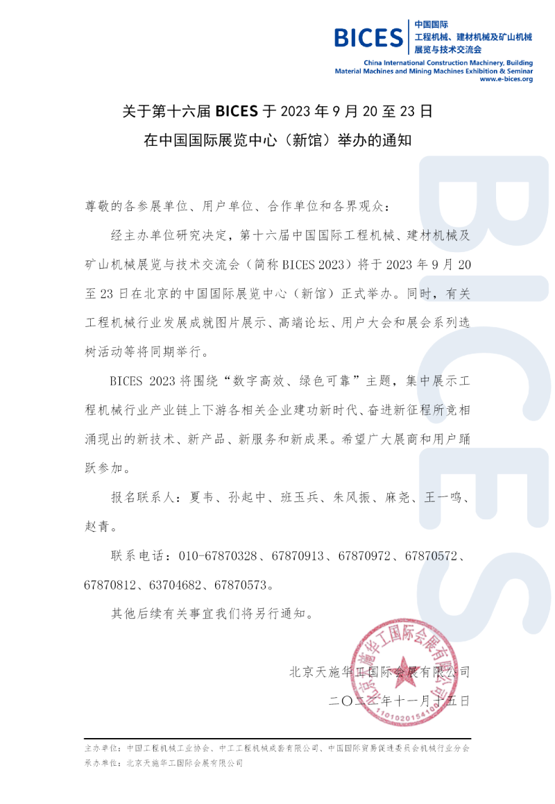 经主办单位研究决定,第十六届中国国际工程机械、建材机械及矿山机械展览与技术交流会(简称BICES 2023)将于2023年9月20至23日在北京的中国国际展览中心(新馆)正式举办。同时,有关工程机械行业发展成就图片展示、高端论坛、用户大会和展会系列选树活动等将同期举行。
