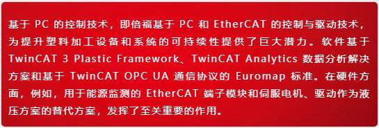 倍福的高动态、高精度伺服驱动技术为能够更好地节约塑料加工中消耗的能源和资源。它还具有出色的可控性、更高的能效等传统液压解决方案所不具备的优势。同时,AM8000 旋转伺服电机、AL8000 直线伺服电机和新型 AA3000 电动缸可以完全省去传统设备或系统中使用液压元件。