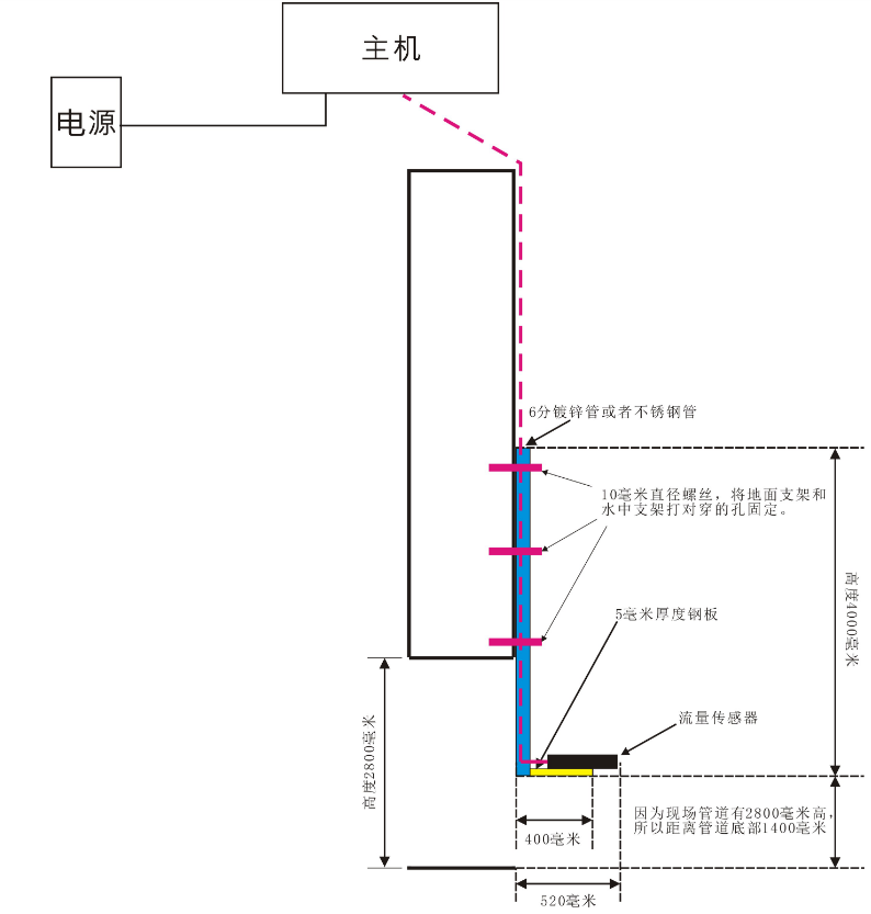 ①首先安装固定支架,确保在最大流速为2倍的情况下稳定可靠。