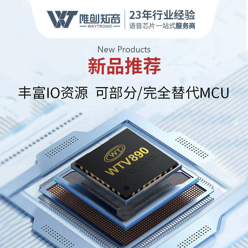 就在今年通过我们不懈努力,研发了一款全新的单片机语音芯片:WTV890系列语音IC,芯片内置32位MCU,可部分/完全替代单片机功能,内置27个I/O扩展资源,能为客户定制更多个性化产品,WTV890系列拥有更多的语音存储空间,以及更强大的功能算法,可为开发初期节省1元左右的MCU开发成本;