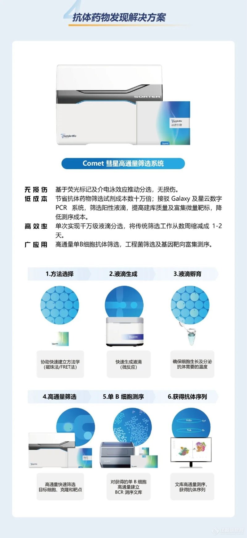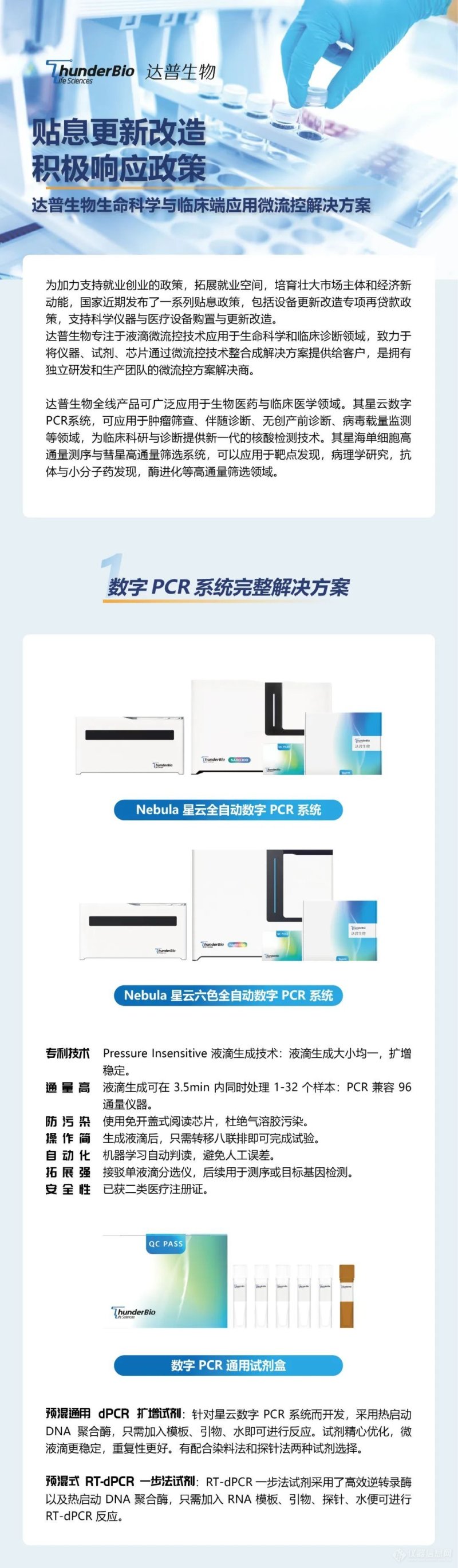 达普生物全线产品可广泛应用于生物医药与临床医学领域。其星云数字 PCR系统,可应用于肿瘤筛查,伴随诊断、无创产前诊断、病毒载量监测等领域,为临床科研与诊断提供新一代的核酸检测技术。其星海单细胞高通量测序与彗星高通量筛选系统,可以应用于靶点发现,病理学研究,抗体与小分子药发现,酶进化等高通量筛选领域。