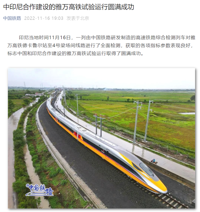 今日,中国铁路微平台宣布,印尼当地时间 11 月 16 日,一列由中国铁路研发制造的高速铁路综合检测列车对雅万高铁德卡鲁尔站至 4 号梁场间线路进行了全面检测,获取的各项指标参数表现良好,标志中国和印尼合作建设的雅万高铁试验运行取得了圆满成功。