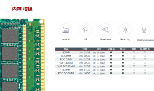 神可(SINKER)系列内存采用原厂优质颗粒,除了具备高效率、低延迟、低耗电的优点,提供30μin镀金,以保护模块免受腐蚀和插入划伤,以实现更高的可靠性和更好的信号完整性;在构建存储器产品需要时使用ASR(抗硫电阻器),使其能够在富含硫的恶劣环境中可靠地运行,以满足最高的工业标准;更支持工控耐宽温规格(-40ºC至85ºC)技术要求,可提升户外基地台的耐用度和使用寿命;神可(SINKER)的特制内存产品专为恶劣环境而设计,经过密集且经过验证的专有测试筛选过程,以确保在极端操作环境中具有最高的可靠性和稳定性。