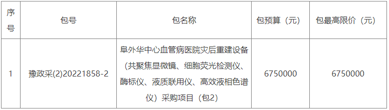 近日,华中阜外医院就“阜外华中心血管病医院灾后重建设备(共聚焦显微镜、细胞荧光检测仪、酶标仪、液质联用仪、高效液相色谱仪)采购项目”公开招标,预算938万元。项目的潜在投标人应在河南省公共资源交易中心网站获取招标文件,并于2022年12月13日09时00分前递交投标文件。