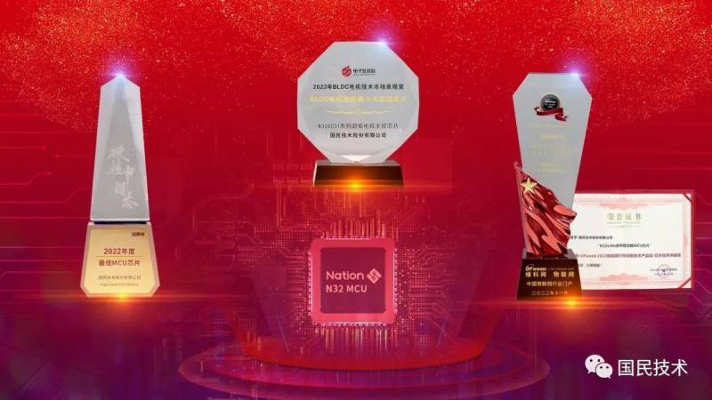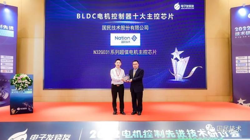 同日,2022电机控制先进技术研讨会暨2022年BLDC电机技术市场表现奖颁奖典礼在深圳举行,国民技术N32G031系列超值电机主控芯片获选“2022年度BLDC电机控制器十大主控芯片”。该奖项由百万电子工程师平台电子发烧友网主办,评选出已稳定量产供货且获得终端客户认可,芯片品牌在业界享有一定知名度和美誉度,产品技术在市场应用方面具有明显方案优势的电控芯片产品。国民技术N32G031系列经过工程师、技术专家和行业分析师评选,在众多电机主控芯片产品中脱颖而出,最终成为该奖项获得者。