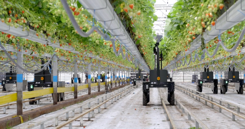 Dean 说:“这家名为 Tortuga AgTech 的美国科罗拉多公司正在制造这些机器人。它们是草莓机器人,可以在某些情况下采摘草莓。他们有机器视觉,所以他们可以识别红色和未成熟的草莓。他们有小剪刀从植物上摘下草莓。而且它们可以在任何天气条件下全天运行,白天或黑夜。”