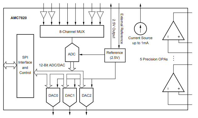 AMC7820 是一个完整的模拟监视和控制电路,包括一个 8 通道、12 位模数转换器 (ADC)、三个 12 位数模转换器 (DAC)、九个ADS7844EB运算放大器、一个热敏电阻电流源、内部 +2.5V 基准和 SPI 串行接口。可以应用外部参考。典型功耗为 40mW。对于 ADC,无缓冲模拟输入范围为 0V 至 +5.0V,缓冲模拟共模输入范围为 0V 至 +3.8V。对于 DAC,模拟输出范围为 0V 至 +2.5V 或 0V 至 +5.0V。