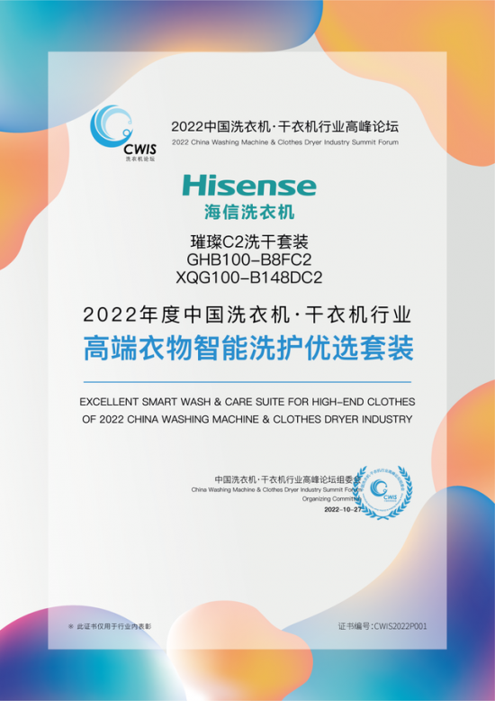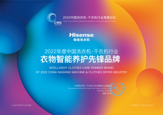 其中,海信洗衣机荣获了2022年度中国洗衣机·干衣机行业“衣物智能养护先锋品牌”称号;海信璀璨C2洗干套装也以其先进的洗干护理功能荣获2022年度中国洗衣机·干衣机行业“高端衣物智能洗护优选套装”奖项;海信初彩系列C60则以大气的外观、焕彩的大屏和健康除菌洗等多样功能成为广大消费者心中的的品质产品,荣获2022年度中国洗衣机·干衣机行业“杰出渠道表现产品”奖项。三项大奖的获得,展现了海信洗衣机不凡洗护实力。