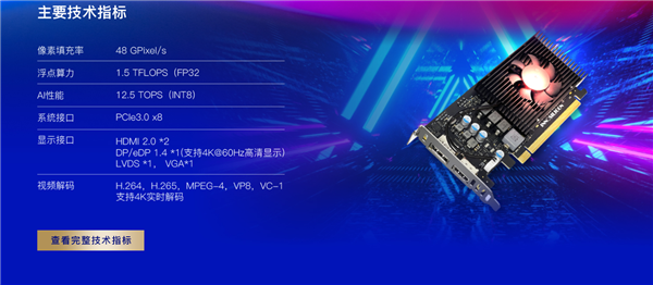 性能指标上,芯片FP32浮点算力1.5Tflops,纹理/像素填充率48GTex/s,AI算力12.5Tops(INT8),内置AI和浮点计算核。