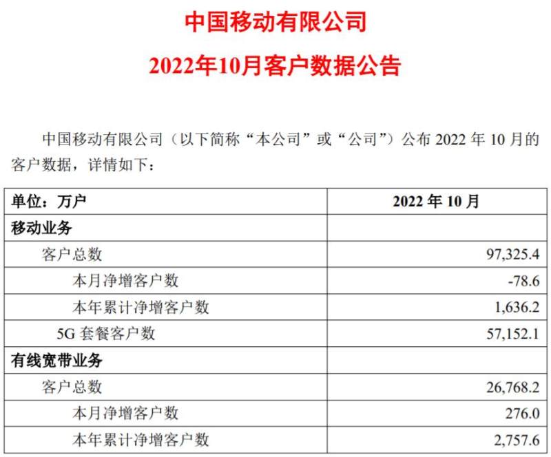 C114讯 11月21日消息 今天,中国移动(600941.SH)公布2022年10月客户数据。