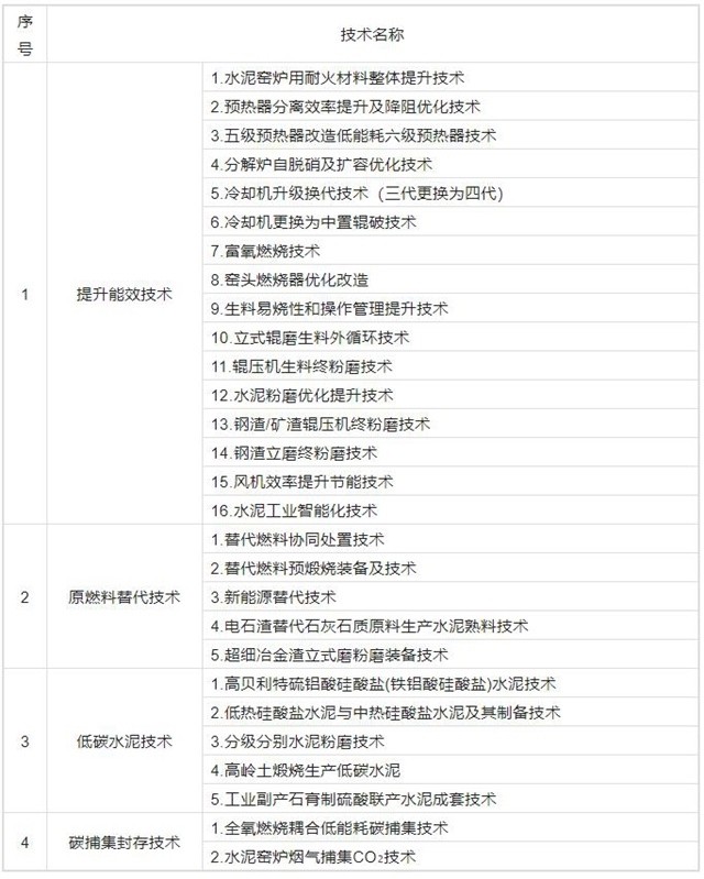 五级预热器改造低能耗六级预热器技术、立式辊磨生料外循环技术、水泥粉磨优化提升技术、钢渣/矿渣辊压机终粉磨技术、风机效率提升节能技术、电石渣替代石灰石质原料生产水泥熟料技术、高贝利特硫铝酸硅酸盐(铁铝酸硅酸盐)水泥技术、全氧燃烧耦合低能耗碳捕集技术等28项都给出了技术路径以及预期效果。