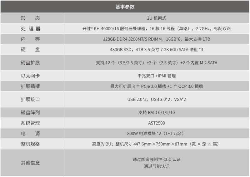 2 路开胜 KH-40000/16 处理器,2.2GHz,最高工作频率 2.7GHz;