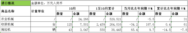 拖拉机方面:10月份进口数量为43辆,进口金额为3,047万元;当月进口数量比去年同期增加65.4%,当月进口金额比去年同期增加9.7%;1至10月累计进口数量为550辆,累计进口金额为38,445万元;累计进口数量比去年同期下降14.5%,累计进口金额比去年同期下降7.8%。