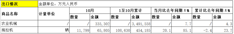 拖拉机方面:10月份出口数量为11,799辆,出口金额为65,805万元;当月出口数量比去年同期增加20.1%,当月出口金额比去年同期增加85.1%;1至10月累计出口数量为108,630辆,累计出口金额为454,185万元;累计出口数量比去年同期下降2.4%,累计出口金额比去年同期增加23.7%。