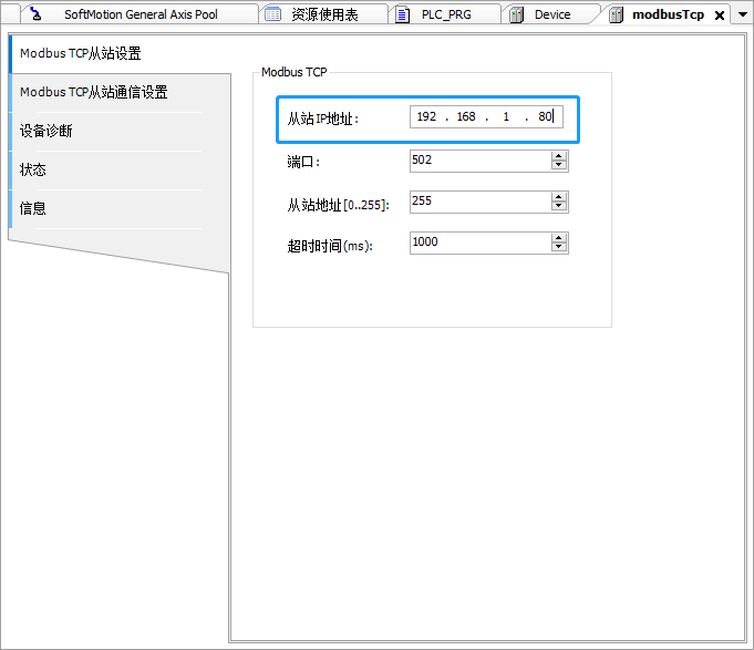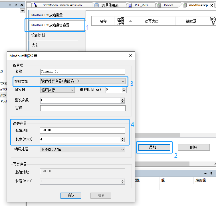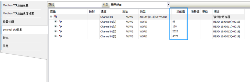 4、在modbus-tcp从站通讯设置点击添加后如图所示(起始地址这里选择0x0010,长度为4)