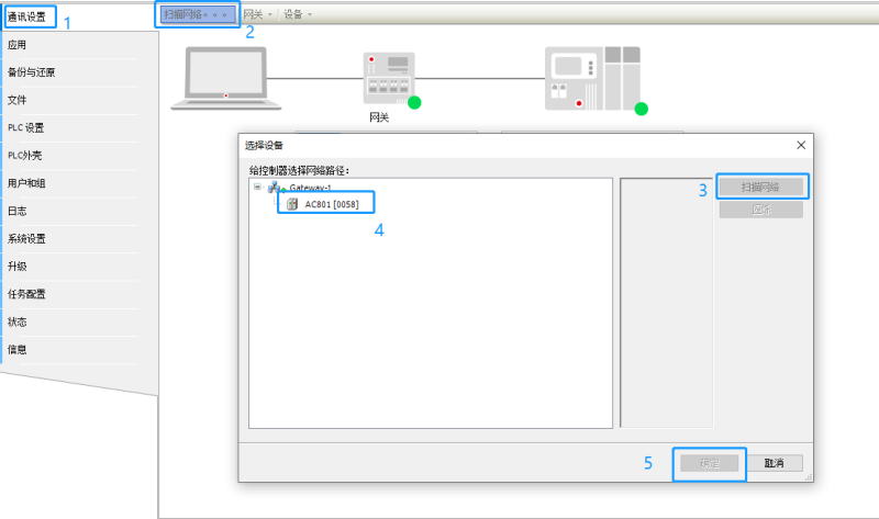 5、在网络组态点击通讯设置后按如图顺序进行操作