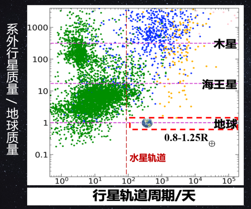 所以说从这个角度来讲,我们确实还没找到跟地球相似的绕着类太阳周围的宜居行星。下面这张图纵坐标是质量,横坐标是轨道周期,把目前找到的所有的系外行星画在这张图上。绿点是用凌星法,即开普勒卫星用的方法,找到的大量行星。蓝点是用视向速度法找到的行星。再一个就是黄点,是用微引力透镜的方法,即测量引力聚焦背景的恒星光导致的光变的方法。