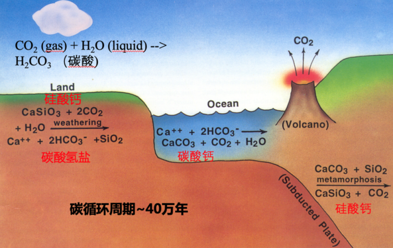 因为地球有板块运动,板块之间相互撞击之后,海洋的板块通常相对柔软,会被别的板块撞到更深的地下,即“地幔”。地幔的压强很大,碳酸钙会转换成硅酸钙,同时把二氧化碳释放出来,因而地幔里面有大量的二氧化碳储存。板块撞击后,会形成火山,火山喷发就会把储存在地幔里面的二氧化碳再一次释放。这种循环的周期是大概40万年。