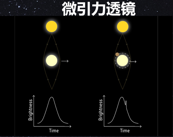 同时我们对着银河系中心区观测,由于引力聚光效应,如果行星刚好经过我们的视线方向,背景的恒星光就会放大变亮。从地球和卫星同时观测,就会观测到先后不同时间发生的背景恒星变亮,进而确定通过行星的位置和质量。
