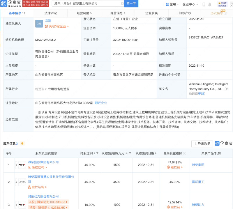 企查查APP显示,近日,潍柴(青岛)智慧重工有限公司成立,法定代表人为冯刚,注册资本1亿元人民币,经营范围包含:矿山机械制造;汽车销售;再生资源销售;金属材料销售等。企查查股权穿透显示,该公司由潍柴动力(000338)等共同持股。