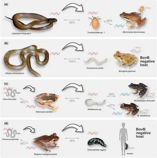 近期,研究人员发现一种起源于蛇的基因Bovine-B(BovB)已经多次跳过物种之间的屏障进入世界各地的青蛙,而且这一现象似乎在马达加斯加发生的频率远远高于其他地方。