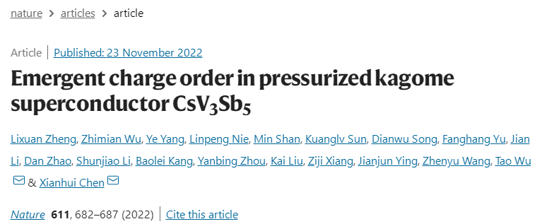 相关论文Emergent charge order in pressurized kagome superconductor CsV3Sb5于近日发表在国际期刊《自然》(Nature)上。