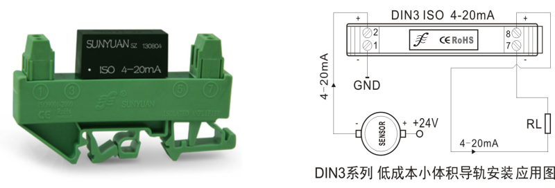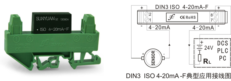 概述:DIN3 ISO 4-20mA小体积、低成本、高精度、标准DIN35导轨安装的模拟量隔离器,是一种将工业现场传感器、PLC模拟信号(4-20mA/0-20mA/0-10mA)隔离后按比例输出(4-20mA/0-20mA/0-10mA)的电流环路隔离器。输入及输出侧宽爬电距离及内部隔离措施使该系列产品可以实现信号输入与信号输出之间隔离电压 3KVDC。DIN3 ISO 4-20mA产品使用非常方便,免零点和增益调节。广泛应用在工业控制系统中仪器仪表与传感器之间的模拟信号输入输出控制,系统内部通过DSP、PLC的DA转换输出信号来显示和控制其它装置的可调输出,工业现场多通道传感器、PLC(4-20mA/0-20mA/0-10mA)的电流环路隔离等。