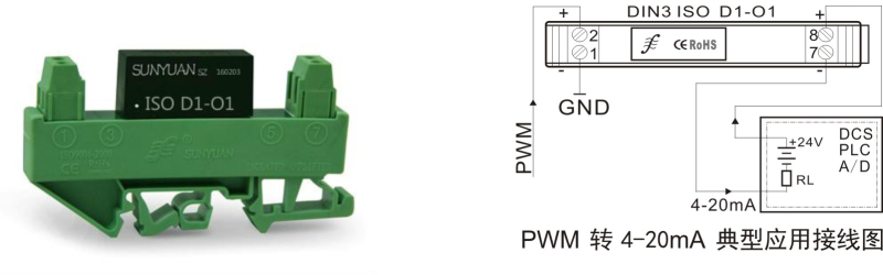 概述:DIN3 ISO D-O1 系列超小体积、低成本、高精度标准DIN35导轨安装无源型 PWM 脉冲调宽信号隔离转换为两线制 4-20mA 变送器。其工作方式是通过后级(输出端)电流回路馈电方式,接收来自前级设备输出的 PWM信号,经过隔离转换后输出对应的 4~20mA 标准两线制电流信号。ISO D-O1 系列 PWM 脉宽变送器是一种将 PWM 方波信号的占空比经隔离转换为模拟标准信号的混合集成电路。产品设计为标准SIP7 Pin封装方式;IC内部包含信号耦合高速隔离变换电路、精密基准电压源开关控制电路、低通滤波电路, 驱动放大电路、VI 转换电路等。产品具有 PWM 信号的转换精度高、线性度好,输出回路供电电压范围宽(12-36VDC)等特点。集成工艺结构及新技术隔离措施使该器件能达到:信号输入与输出 3000VDC 隔离,并且能满足工业级宽温度、潮湿、震动的现场恶劣工作环境要求。