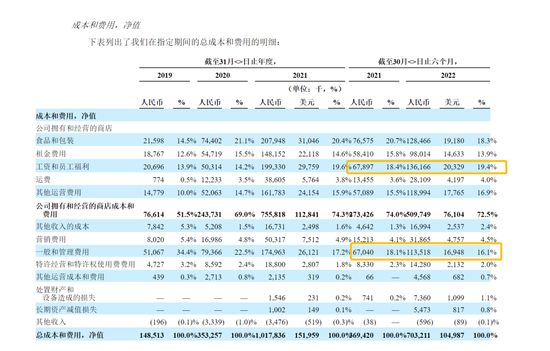 从2022年第三季度的费用来看,总运营成本为33.094亿元,同比增长40.4%。其中,材料成本为14.4亿元,占总收入的37%;商店租金和其他运营成本7.7亿元,占总收入的20%;送货成本4.33亿元,占总收入的11%,都低于收入增幅的65%。