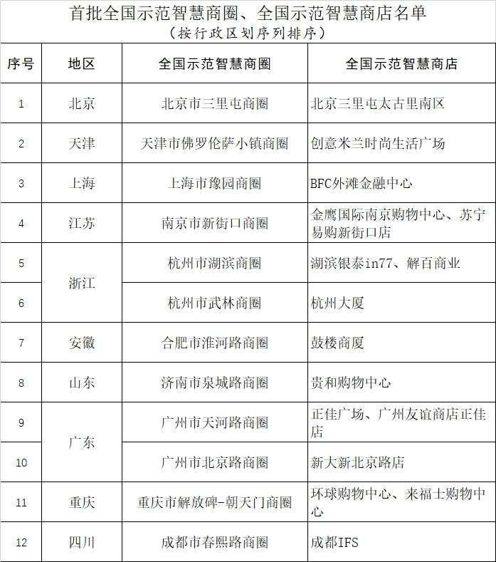 据商务部消息,商务部委托第三方机构组织专家对有关商圈、商店申报材料进行评审,初步确定12个全国示范智慧商圈、16个全国示范智慧商店,现将名单予以公示。