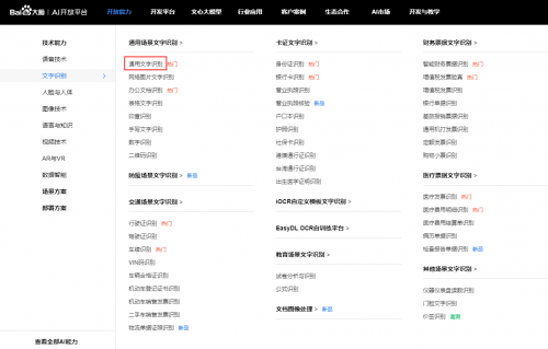 搜索打开网站,点击【开放能力】-【文字识别】选项,这里有多种功能可以选,一般选【通用文字识别】即可。