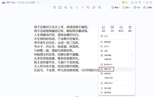 当我们在查看图片的时候,只需右键点击【提取文字】,即可开启软件内置的【图片转文字】功能,从而直接提取出图片里的文字。