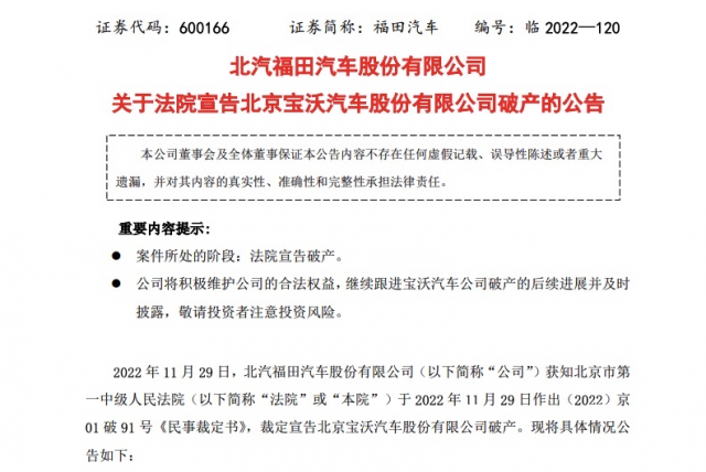 【TechWeb】11月30日消息,福田汽车今日发布公告称,北京宝沃汽车股份有限公司正式宣告破产。