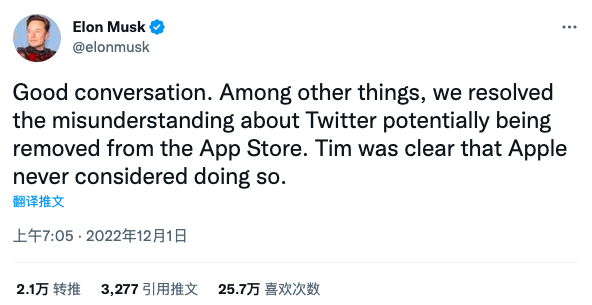 “很好的对话。除其他事项外,我们解决了关于Twitter可能被App Store下架的误解。蒂姆明确表示,苹果从未考虑这样做。”