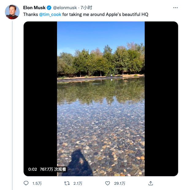 马斯克没有提到两人可能讨论的内容。宁静的画面与两天前这位Twitter新老板炮轰苹果的一系列画面形成鲜明对比。