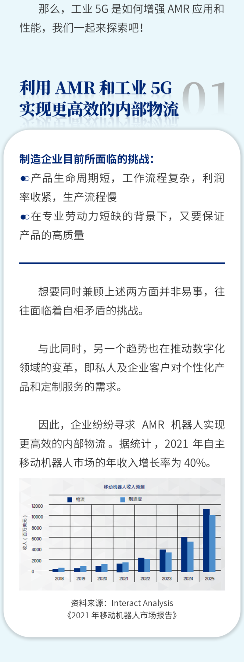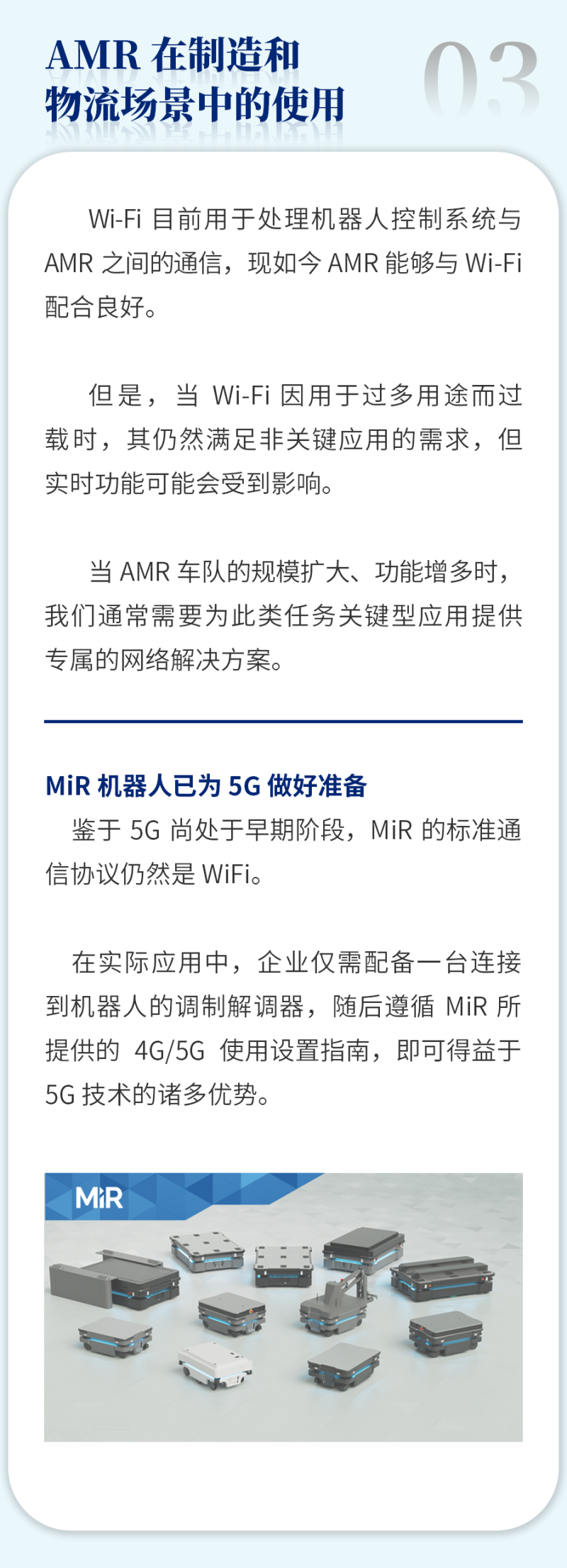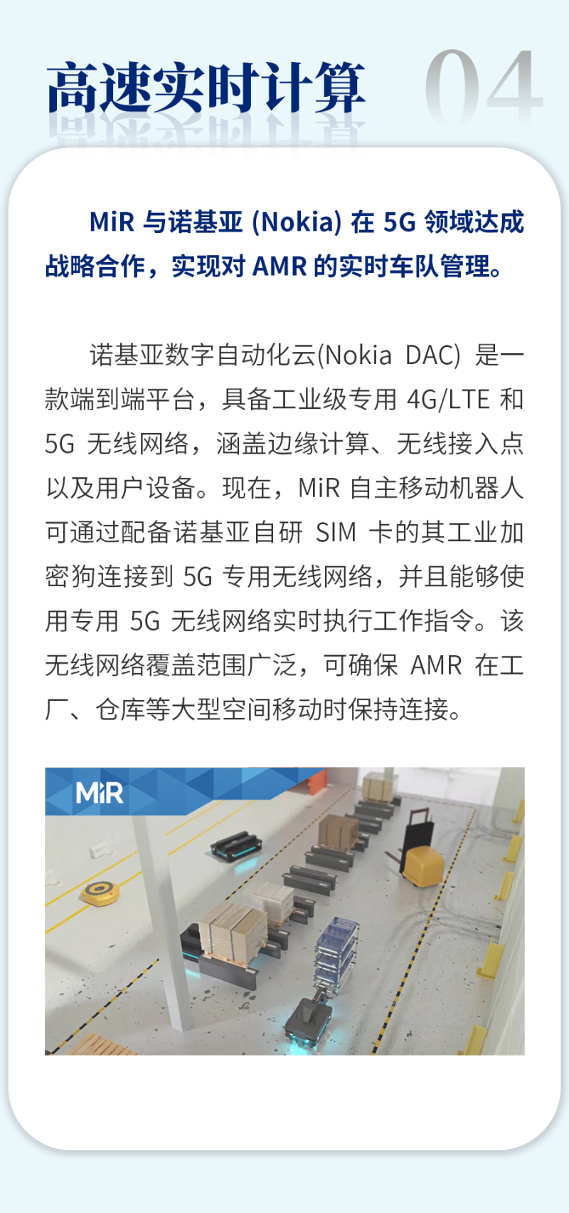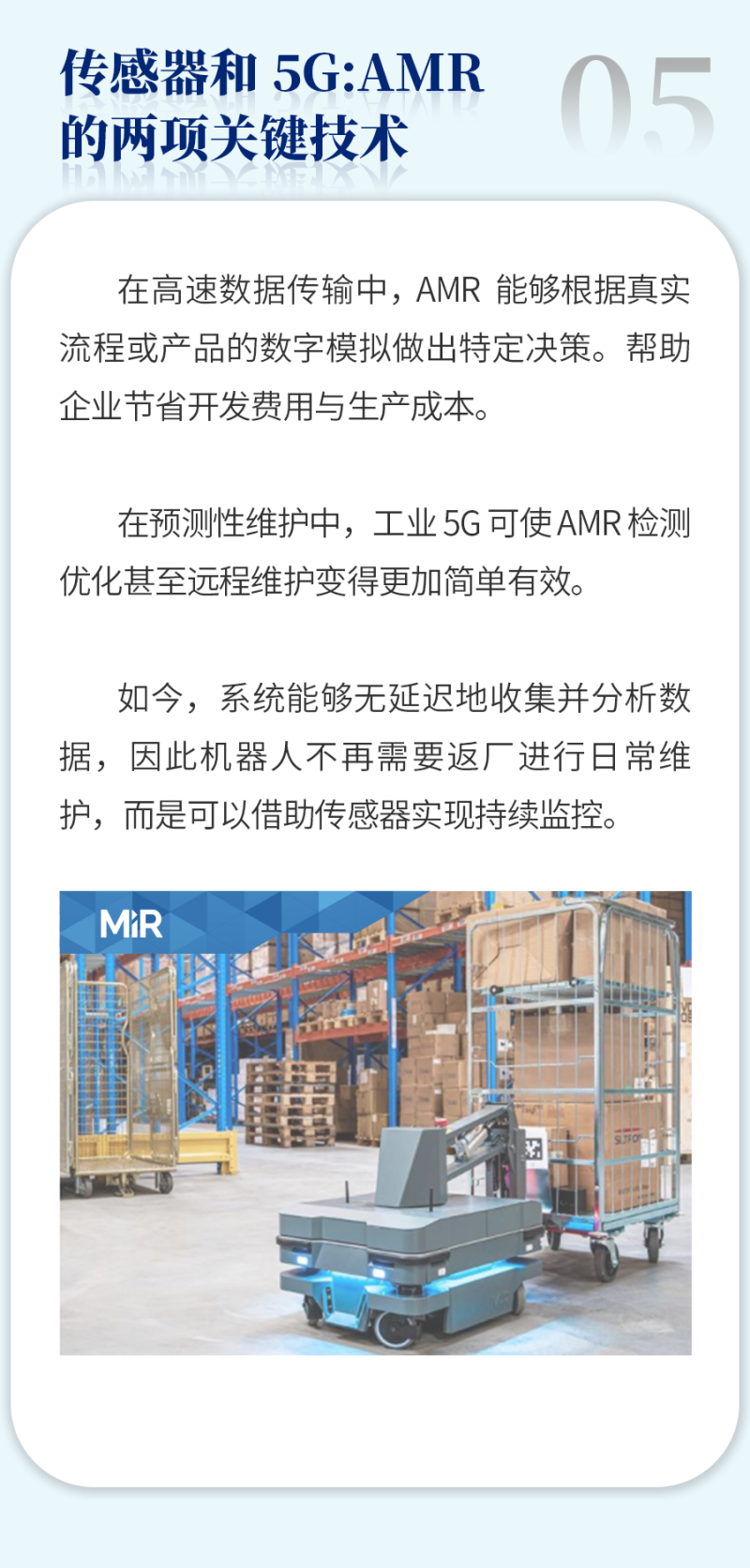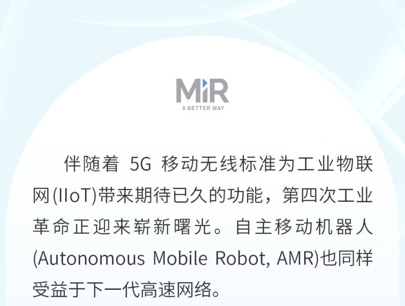 Mobile Industrial Robots (MiR) 致力开发并制造业界领先的自主移动机器人 (Autonomous Mobile Robot,简称:AMR) 。AMR 技术能够快速、轻松且经济高效地实现内部物流自动化及优化物料搬运。目前全球已有众多来自制造业、物流业及医疗卫生领域的客户引入了 MiR 业界领先的 AMR 产品,这些企业及机构的规模涵盖大型集团及中小型机构。MiR 于 2013 年成立于丹麦,现已发展成为全球移动机器人市场的领导者,在 60 个国家拥有近 220 家分销商和认证系统集成商。2018 年,MiR 由全球著名的自动测试设备供应商泰瑞达 (Teradyne) 收购,并于 2022 年与泰瑞达旗下 AutoGuide Mobile Robots 合并,合并后 MiR 提供的产品能够广泛覆盖各类不同负载的需求。MiR 总部位于丹麦欧登塞,并在纽约霍尔布鲁克、加利福尼亚州圣地亚哥、马萨诸塞州北雷丁、肯塔基州乔治敦、新加坡、法兰克福、巴塞罗那、东京、首尔和上海设有区域办事处。如欲了解更多信息,请访问我们的网站:www.mobile-industrial-robots.com.cn