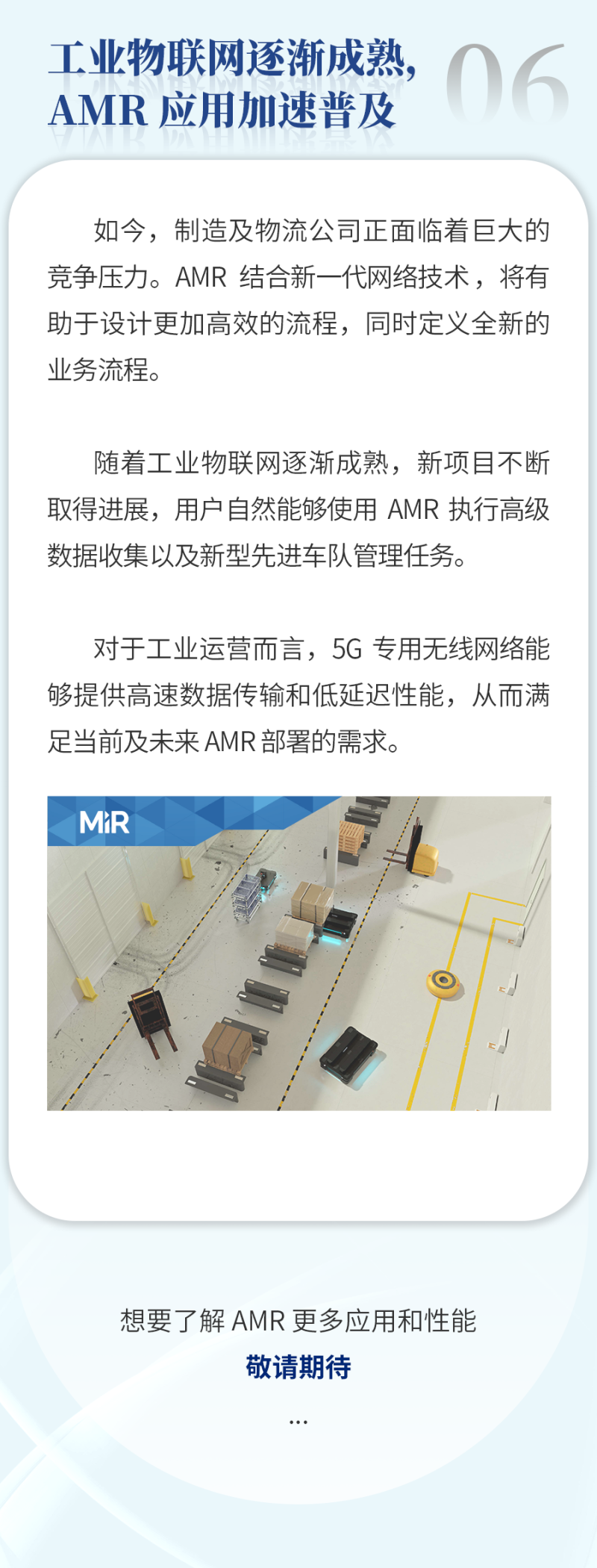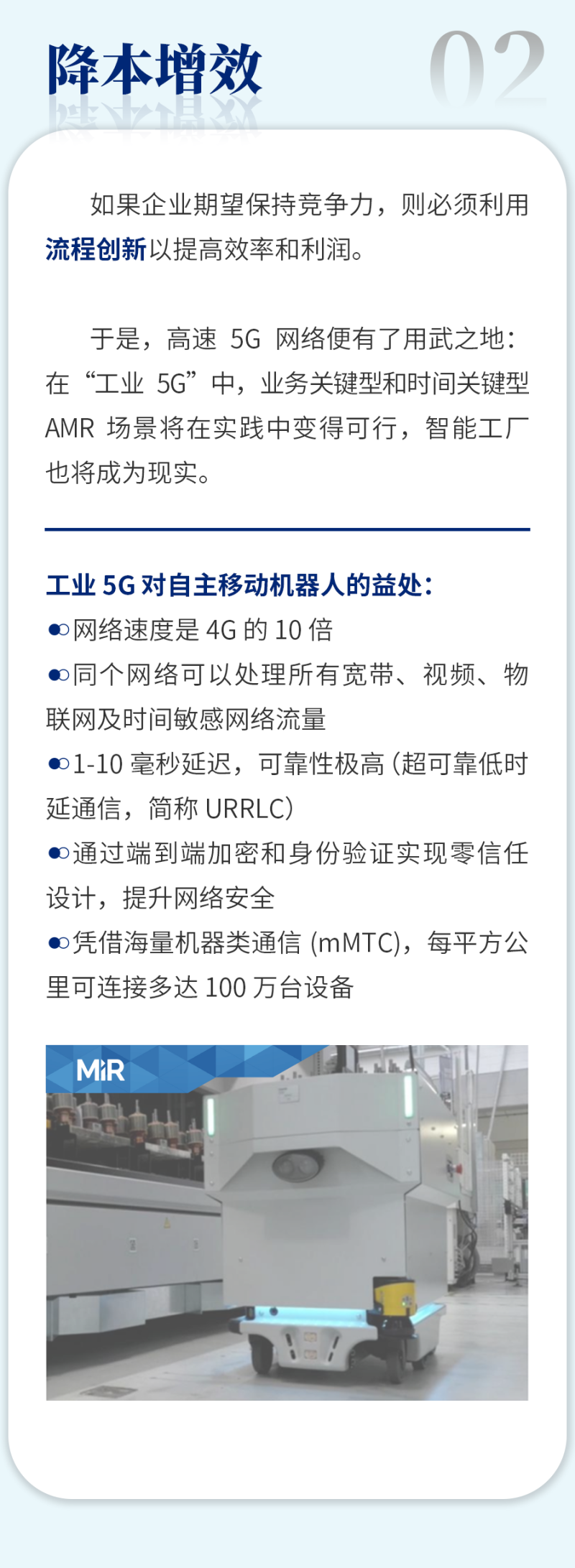 MiR致力于研发简单易用且灵活安全的机器人,帮助各类公司提高运营效率。MiR的自主机器人是新一代的先进移动机器人,具有投资回报快的特点,通常一年内就能收回成本。这些独特的协作机器人现已在工业及医疗保健行业大放异彩,帮助这些行业的制造商实现内部运输自动化。