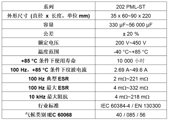 作为采用非固态电解液的极化铝电解电容器,器件符合RoHS标准,特别适合要求使用寿命达到10至15年的各种脉冲电源滤波、缓冲和储能应用。典型终端产品包括工业电机驱动、列车和地铁铁路牵引、焊机、暖通空调(HVAC)、UPS、风力发电机和光伏逆变器、医用X光机。