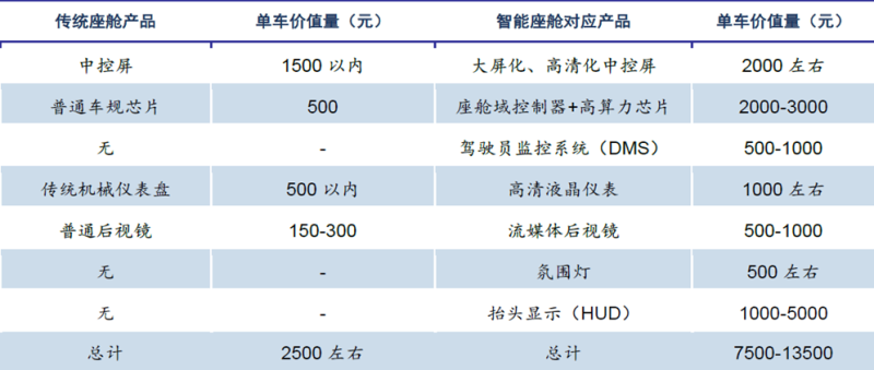 从价值量来看,传统汽车座舱单车价值量在2500元左右,随着座舱在中控屏、仪表盘、后视镜、芯片、声学系统的部件升级,以及座舱域控制器、驾驶员监控系统(DMS)、智能语音、氛围灯、抬头显示(HUD)等部件新增,整套智能座舱整体价值量有望达到0.75万元-1.35万元,为传统座舱的3-5倍。