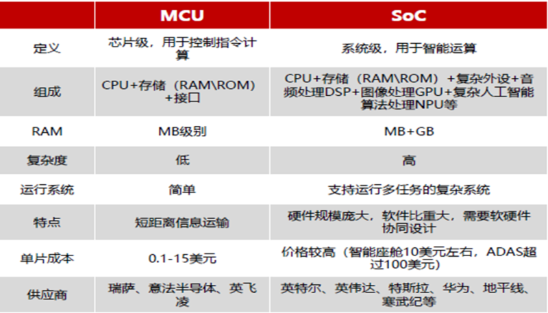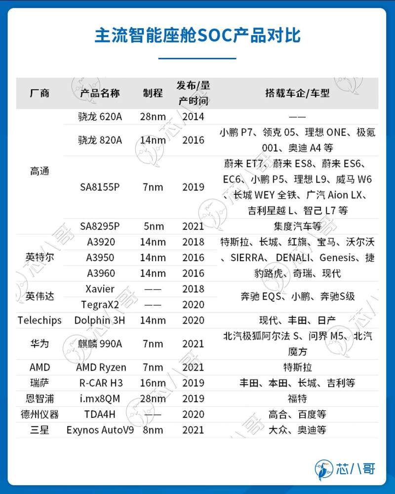 业内人士指出,目前智能座舱中低端与高端的主要区别在于方案是采用MCU还是SoC。其中NXP、瑞萨、德州仪器等传统汽车芯片龙头由于长期以来与传统主机厂合作关系良好,目前以MCU产品为主, 产品线齐全,车规级芯片积累较多;而高通、英伟达、英特尔、AMD、三星等消费电子领域巨头由于资金雄厚,可支撑起对先进制程和高算力芯片的研发投入,目前以更复杂的SoC产品为主;国内科技公司大部分有互联网公司背景,具备“算法+芯片”的软硬件耦合全栈式解决方案能力,因此也以SoC为主。