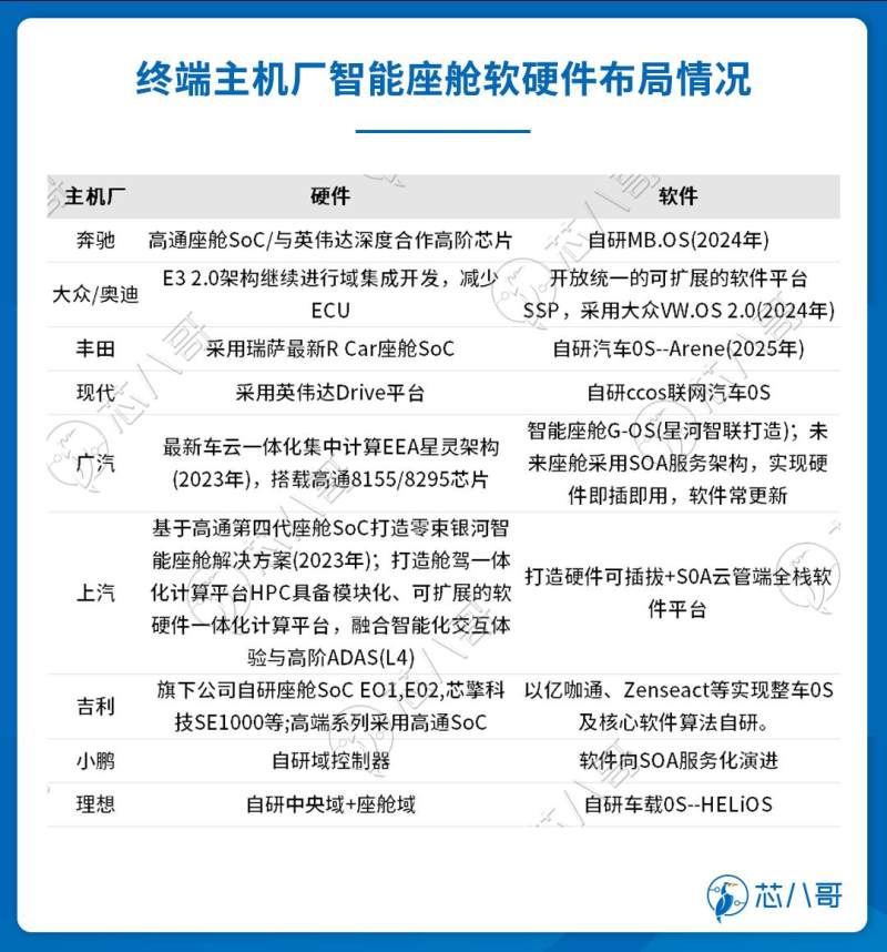 同时,传统车企如大众、丰田、现代、吉利、上汽、广汽等也推出了多款安装智能座舱的电动车。比如丰田在硬件上采用瑞萨最新R Car座舱SoC,在软件上自研的汽车0S—Arene,预计将在2025年推出;和丰田类似,现代在硬件上采用英伟达Drive平台SoC芯片,但在软件上已经在自研自家的操作系统-ccos联网汽车0S;吉利在中低端硬件层面主要以旗下公司自研的座舱SoC EO1/E02为主,但高端系列芯片仍然采用高通SoC产品作为量产主力。